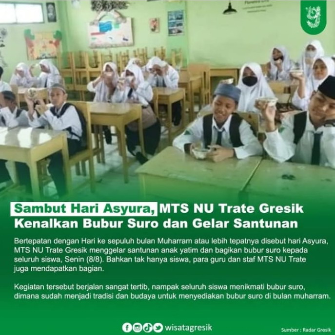 Bulan Muharram merupakan salah satu bulan istimewa bagi umat Islam, khususnya pada tanggal 10 Muharram yang setiap tahun diperingati sebagai hari paling baik untuk menyantuni anak yatim/piatu. Sejalan dengan itu, MTs NU Trate Gresik pun turut memperingati hari baik tersebut. Sebanyak 44 peserta didik yatim/piatu mendapatkan santunan di hari peringatan 10 Muharram ini, yakni 8 Agustus 2022. Selain itu, MTs NU Trate pun memberikan bubur suro kepada seluruh peserta didik dan Bapak/Ibu Guru MTs NU Trate Gresik yang berjumlah kurang lebih 400 porsi. Momen ini dilakukan dengan tujuan memperkenalkan budaya dan bubur suro kepada peserta didik MTs NU Trate Gresik.